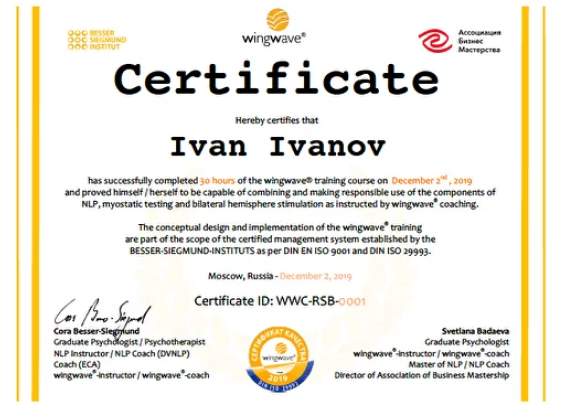 Пройти программу по профессиональной переподготовке Академии нейрокоучинга Светланы Бадаевой, где wingwave коучинг является одним из обязательных инструментов, и получить диплом установленного образца по специальности “Нейрокоучинг. Нейропсихология. Практический психолог” с правом ведения частной практики на территории РФ.(подробнее)